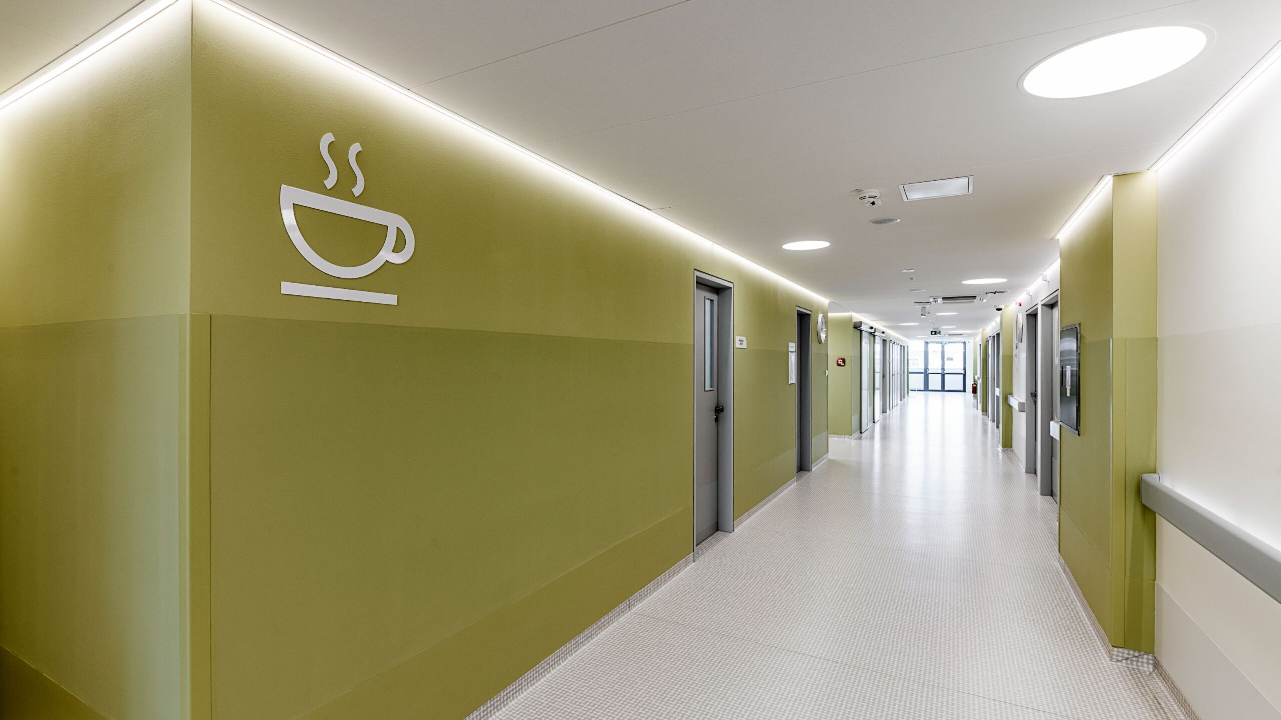 Olomouc University Hospital’s new Y Pavilion brings modern visual aesthetics to the site of the former car park in the north-western part of the complex. Connected to the neighbouring pavilion by an elevated enclosed footbridge, the building is U-shaped with a white façade and windows with elegant anthracite frames. The windows’ sloping sills and lintels supply the interiors with ideal daytime light.